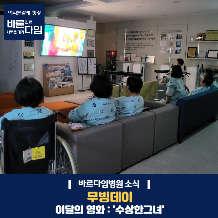 안녕하세요.치료에서 일상까지 ALL바르게바르다임병원입니다.벌써 서늘한 가을날씨가 다가오고 있습니다.저희 병원에서는 입원 환자분들을위해 작은 영화상영을 진행하고 있는데..
