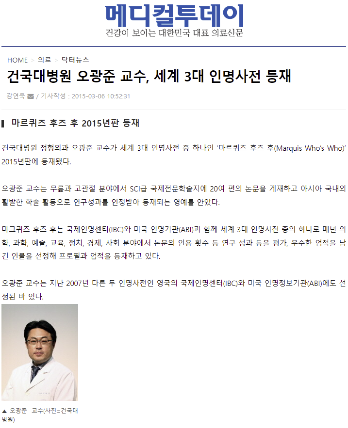 오광준 관절 센터장, 대한 고관절학회 최우수 논문 구연상 공동수상