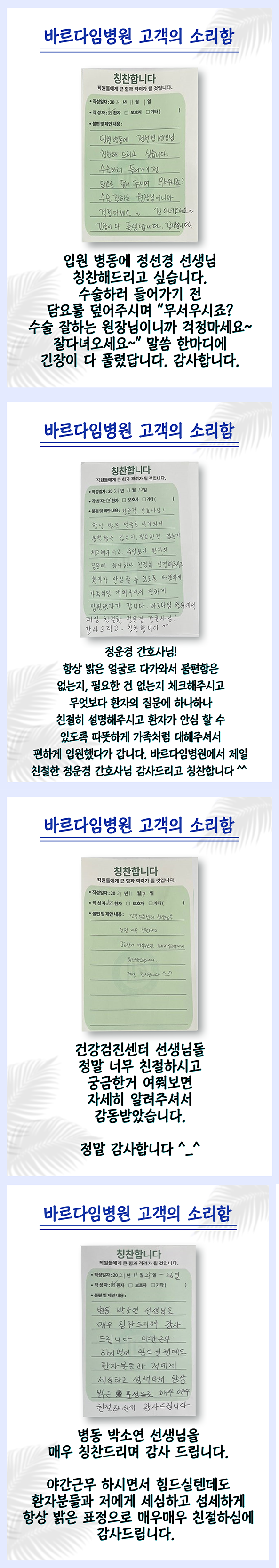 바르다임병원을 이용하시면서 느꼈던 친절함이나 불편함은 언제든지 고객의 소리함을 통해 소중한 의견을 남겨주세요