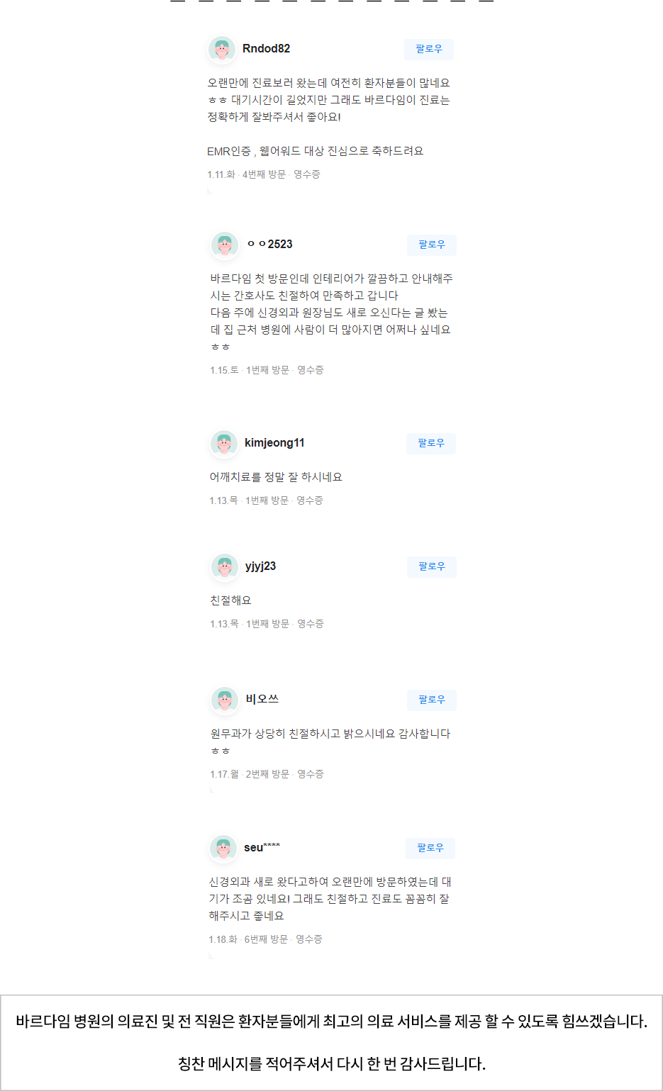 여러분의 소중한 의견을 반영하고 개선하여 함께 동행할 수 있는 바르다임병원을 만들어가겠습니다.