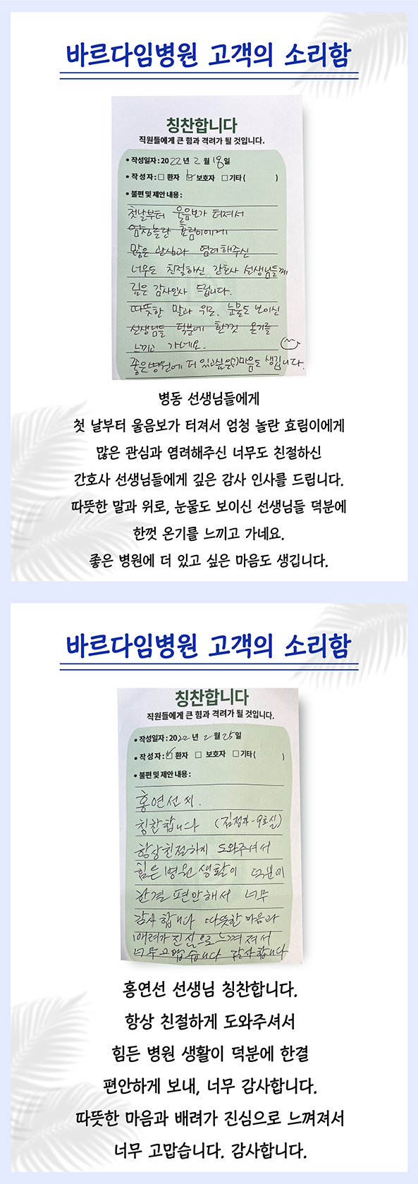 바르다임병원을 이용하시면서 느꼈던 친절함이나 불편함은 언제든지 고객의 소리함을 통해 소중한 의견을 남겨주세요