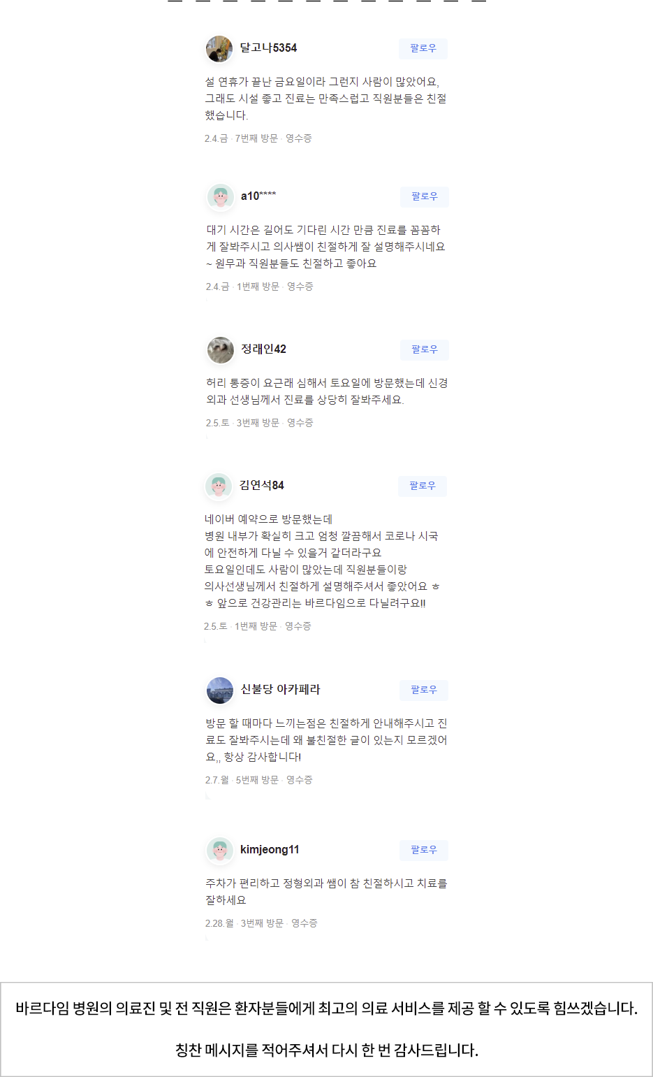 여러분의 소중한 의견을 반영하고 개선하여 함께 동행할 수 있는 바르다임병원을 만들어가겠습니다.