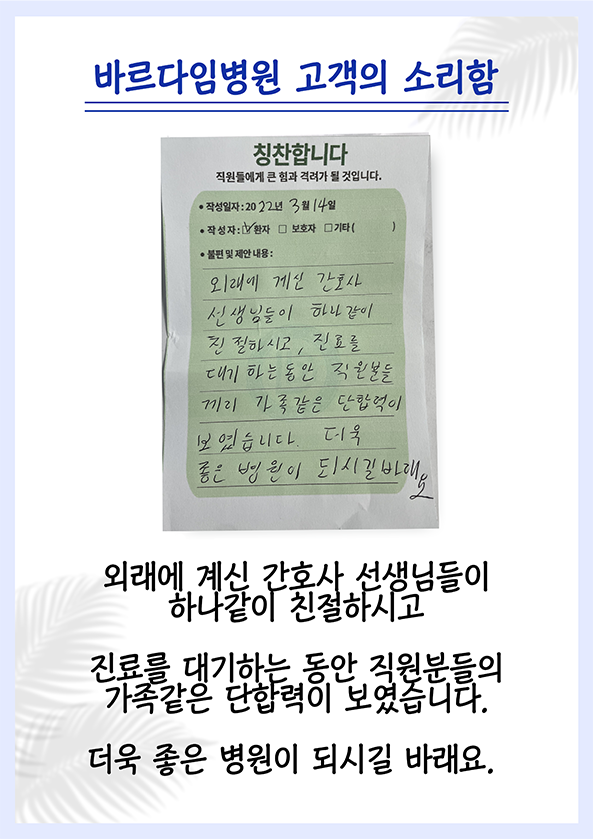 바르다임병원을 이용하시면서 느꼈던 친절함이나 불편함은 언제든지 고객의 소리함을 통해 소중한 의견을 남겨주세요