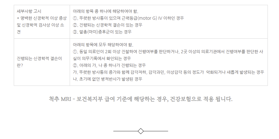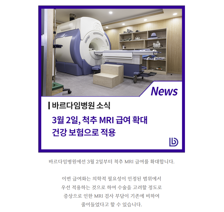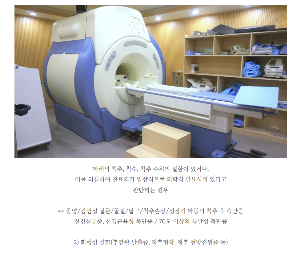 위 내용 확인하시어 오는 3월부터 적용되는 척추 MRI 검사 보험 급여 대상자 확대를 참고하시면 되겠습니다. >> 자세히보기 <<