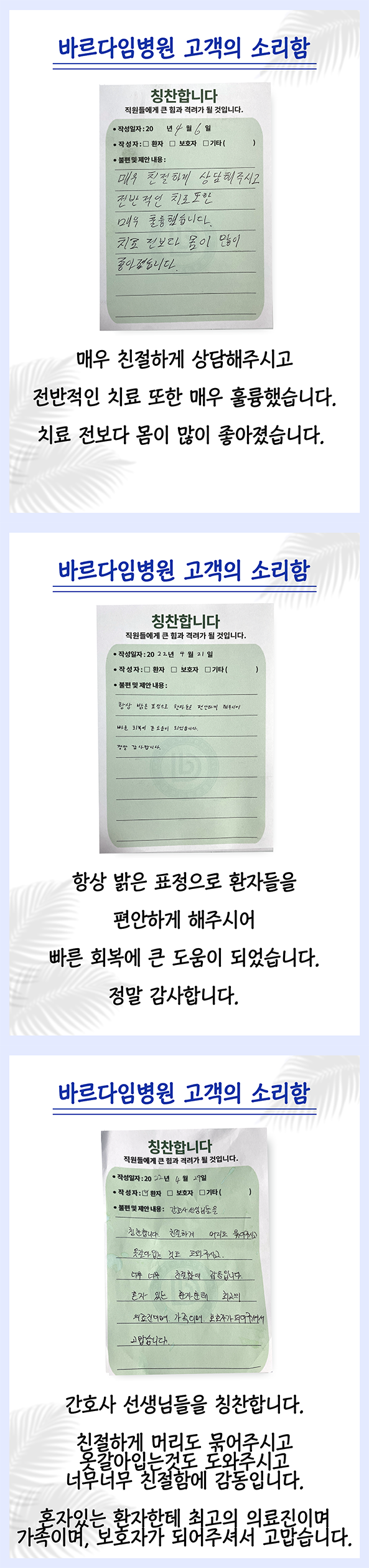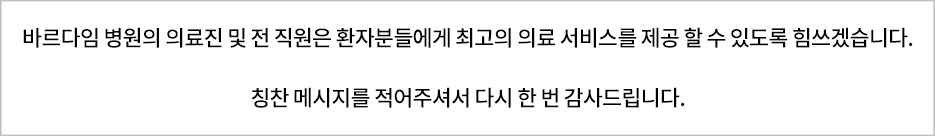 여러분의 소중한 의견을 반영하고 개선하여 함께 동행할 수 있는 바르다임병원을 만들어가겠습니다.