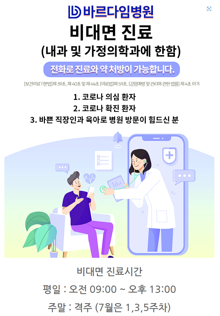 비대면 진료는 내과 및 가정의학과에 한하여 진행중이며