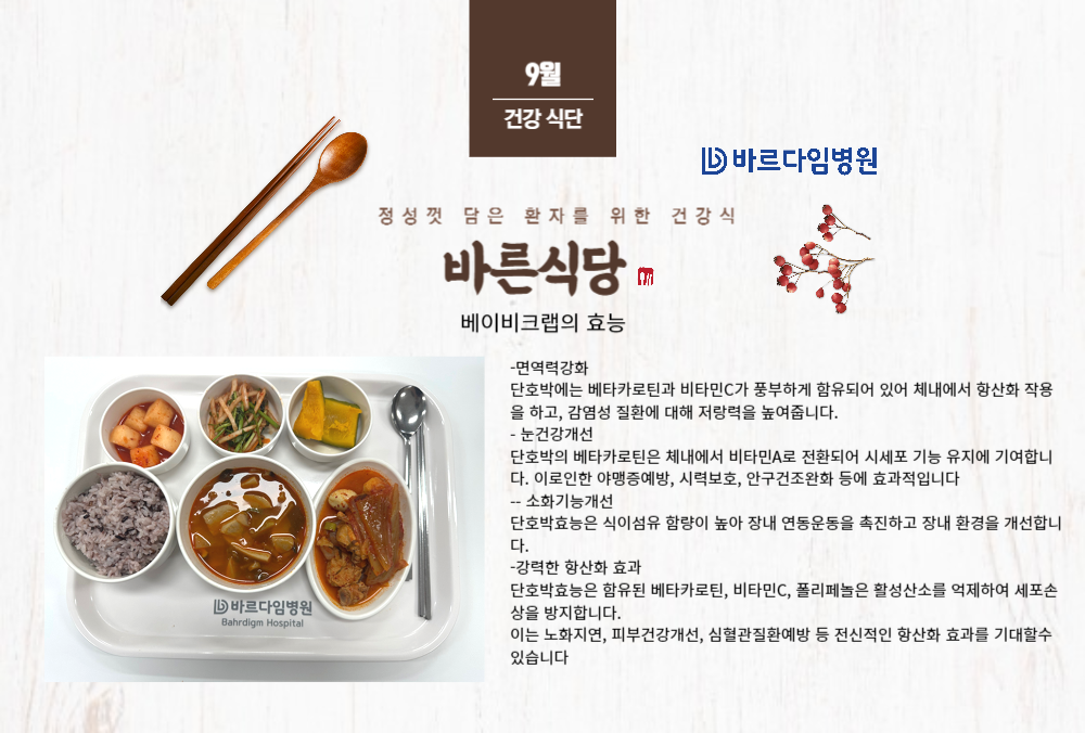 바르다임병원은 신선한 식재료를 이용한 균형 잡힌 식단 구성으로 늘 건강하고 영양 가득한 식사를 제공하고 있습니다.