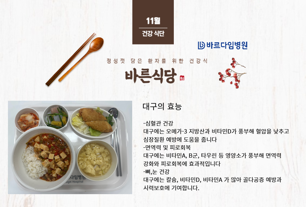 바르다임병원은 신선한 식재료를 이용한 균형 잡힌 식단 구성으로 늘 건강하고 영양 가득한 식사를 제공하고 있습니다.