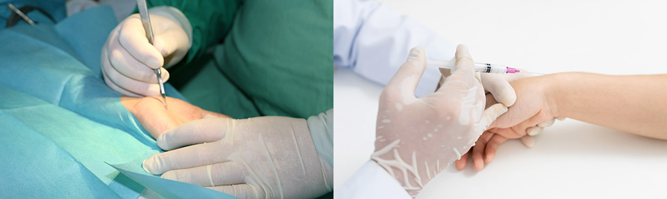 원인 인자가 확실한 경우엔 수술적 치료를 우선적으로 고려해야 합니다. 수술 치료를 하지 않는 경우 점차 증상이 심해지고 신경 마비에 따른 근육위축도 오게 됩니다. 수술적 치료는 정중 신경을 압박하는 손목인대를 절개, 터널내의 압력을 낮춰주는 수술이 필요합니다. 밤에 손이 저려서 깰 정도라면 수술이 꼭 필요한 경우입니다. 가능한 근위축이 생기기전에 수술하는 것이 좋습니다.