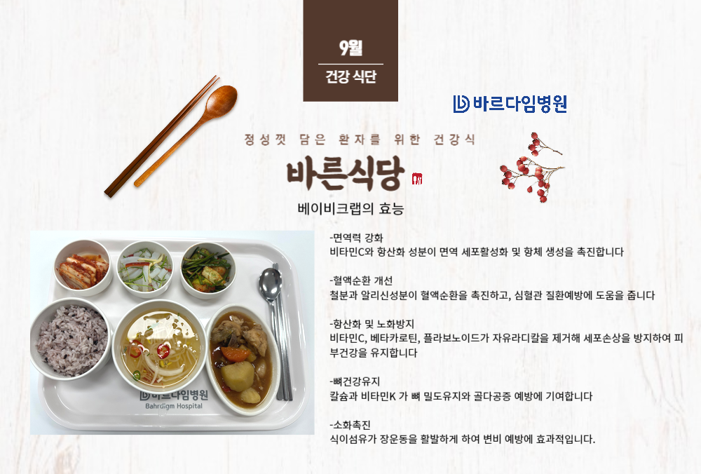 2025년 9월 둘 째주 입원 식단을 소개합니다. 바르다임병원은 신선한 식재료를 이용한 균형 잡힌 식단 구성으로 늘 건강하고 영양 가득한 식사를 제공하고 있습니다.&n..