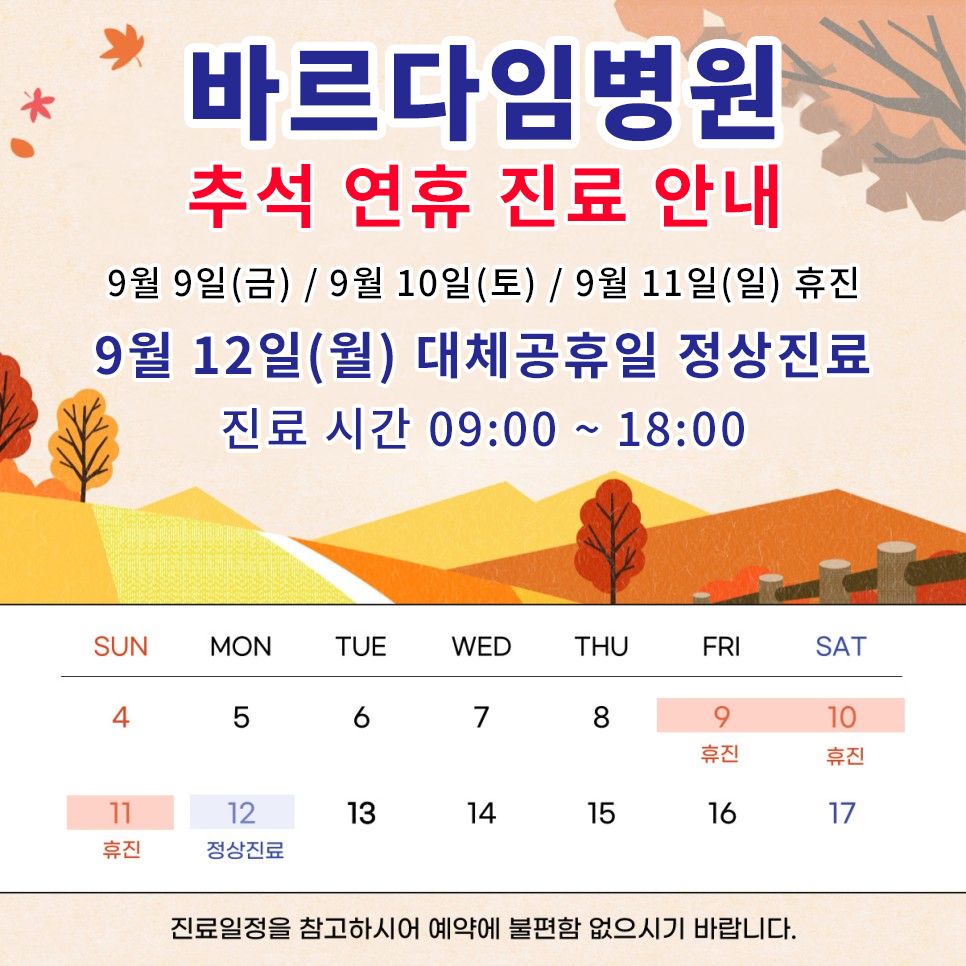 바르다임병원은 9월 9일(금) ~ 9월 11일(일)까지 휴진하고