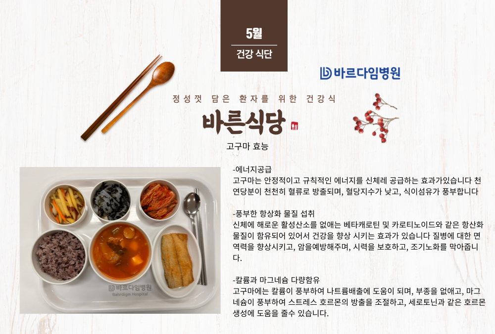 바르다임병원은 신선한 식재료를 이용한 균형 잡힌 식단 구성으로 늘 건강하고 영양 가득한 식사를 제공하고 있습니다.