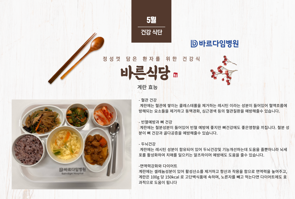 바르다임병원은 신선한 식재료를 이용한 균형 잡힌 식단 구성으로 늘 건강하고 영양 가득한 식사를 제공하고 있습니다.
