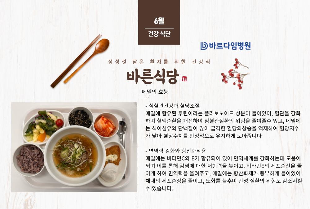 바르다임병원은 신선한 식재료를 이용한 균형 잡힌 식단 구성으로 늘 건강하고 영양 가득한 식사를 제공하고 있습니다.