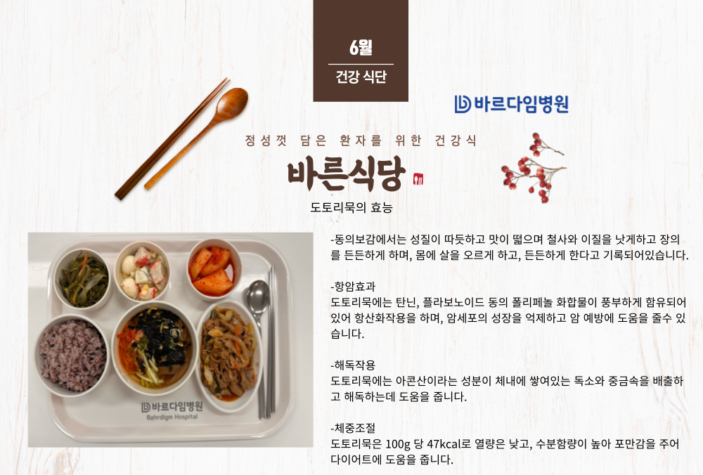 바르다임병원은 신선한 식재료를 이용한 균형 잡힌 식단 구성으로 늘 건강하고 영양 가득한 식사를 제공하고 있습니다.