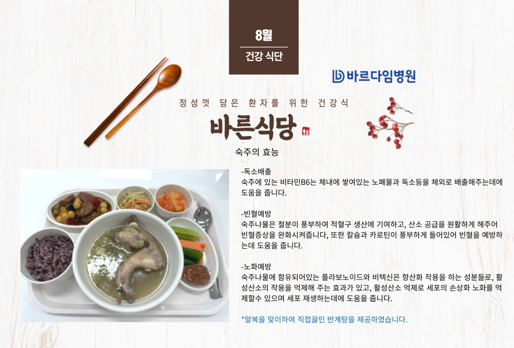 바르다임병원은 신선한 식재료를 이용한 균형 잡힌 식단 구성으로 늘 건강하고 영양 가득한 식사를 제공하고 있습니다.