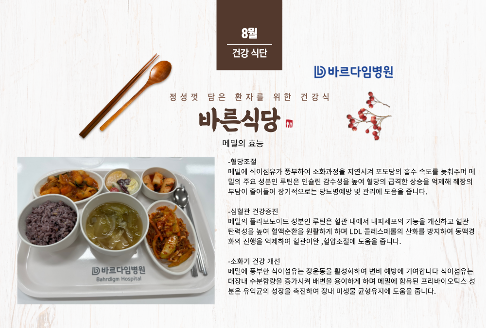 바르다임병원은 신선한 식재료를 이용한 균형 잡힌 식단 구성으로 늘 건강하고 영양 가득한 식사를 제공하고 있습니다.