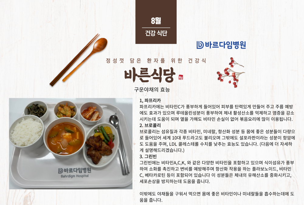 바르다임병원은 신선한 식재료를 이용한 균형 잡힌 식단 구성으로 늘 건강하고 영양 가득한 식사를 제공하고 있습니다.