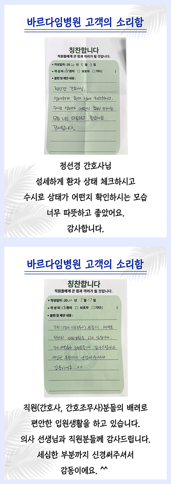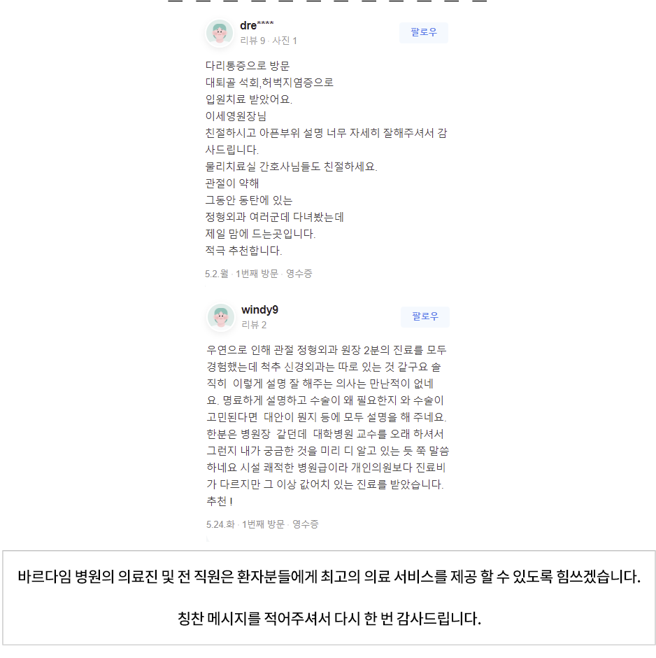 여러분의 소중한 의견을 반영하고 개선하여 함께 동행할 수 있는 바르다임병원을 만들어가겠습니다.